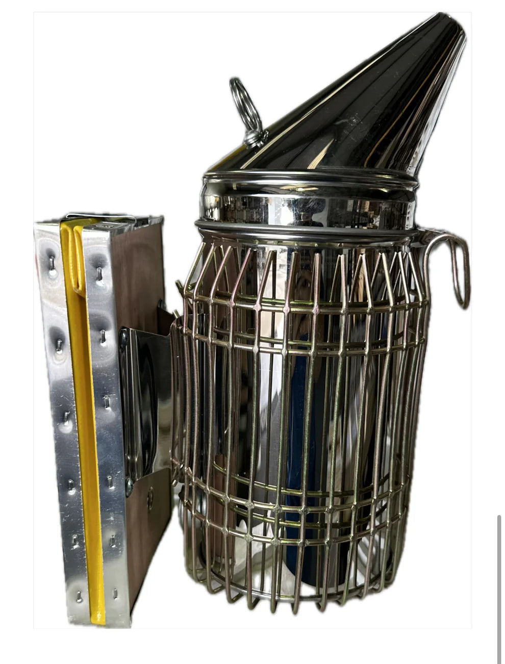 Smokers are used to help calm the bees when inspecting a hive. It minimises the defensive behaviour within the colony and decreases the risk of being stung. Bee smokers are a must in order to be safe when handling bees.