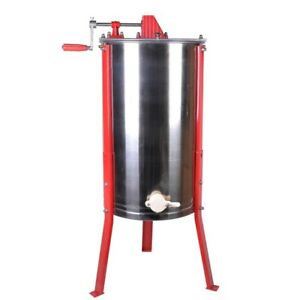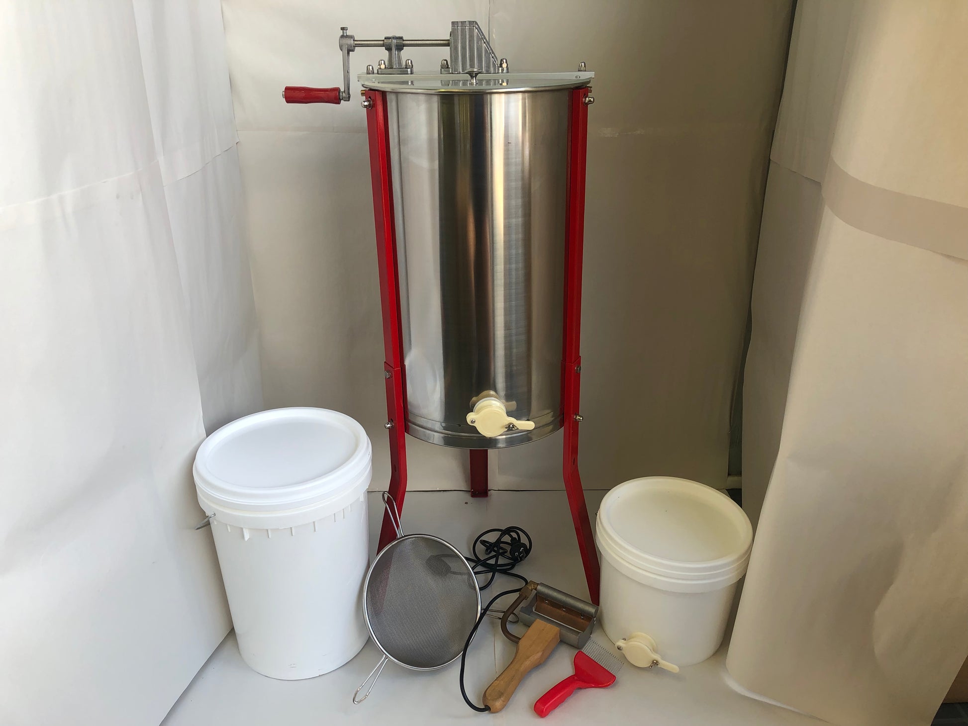 Extractors are used to extract honey from frames. Frames sit in the basket vertically and spin around in a circle. As a result, the motion makes the honey fly out of the cell and into the bottom of the barrel. From then, the honey drains into a bucket ready to be sieved and packed.