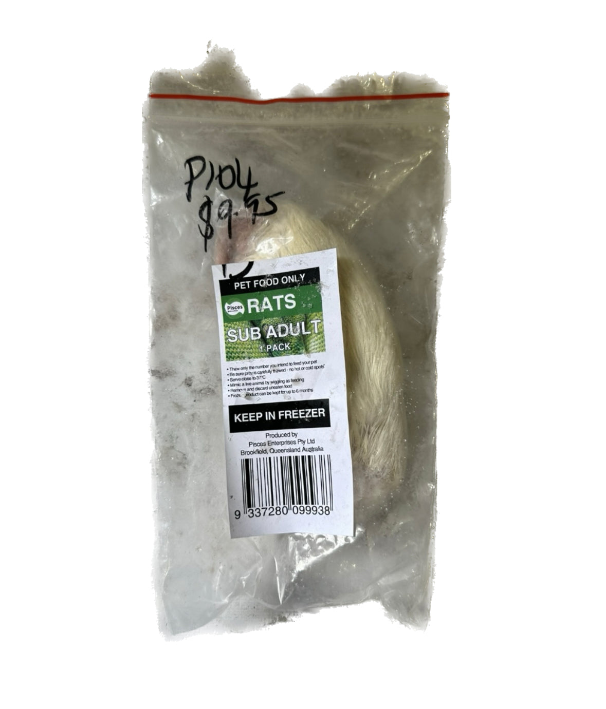 Frozen Sub Adult Rat - 1 Pack is a convenient and nutritious food option for your snake. This single pack contains a frozen rat, providing a natural and balanced meal that supports your snake’s health and growth. Easy to store and feed, it’s ideal for keeping your pet well-nourished with minimal effort.