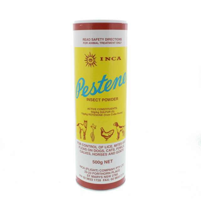 Inca Pestene Insect Powder 500g is designed to treat mites, lice, and fleas on poultry, dogs, and livestock. This easy-to-use powder helps protect your animals from irritating pests, promoting their health and comfort. Perfect for keeping your farm animals and pets free from unwanted insects.