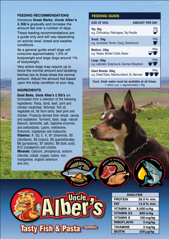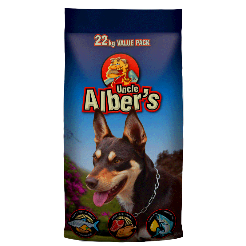 Uncle Alber's is formulated from a selection of the following ingredients: Pasta, fish meal, lamb, beef, pork and chicken meat meal, fish oil, vegetable oil, fat from chicken, beef, lamb and pork. Products derived from wheat, canola and soyabeans. Turmeric, natural flavours, bentonite, salt, digestive enzymes and antioxidants. Lysine, methionine, threonine, tryptophan and isoleucine.