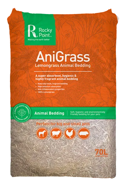 Rocky Point’s AniGrass Lemongrass Bedding is a highly fragrant premium animal bedding. It is sustainably and organically grown specifically for animal litter. This long lasting fibre naturally deodorises any environment. Finely chopped and dust extracted it can be blended with other fodder to bed small animals, for instance blending with wood shavings will enhance hygiene, fragrance and animal comfort.