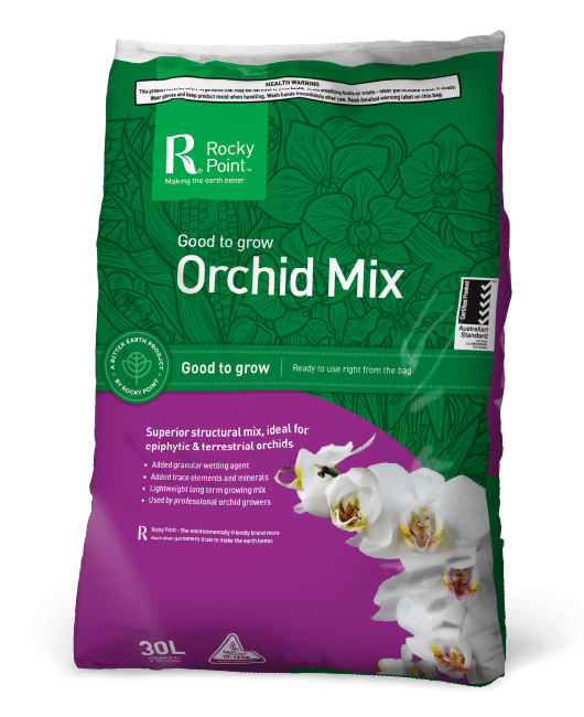 As a general rule orchids dislike being over potted, so when selecting your pot choose one that comfortably fits the root system and allows for two year of vegetative growth. Ensure the post has adequate drainage holes and that they are clear of any excess plastic. Rocky Point Orchid Mix is ready to use straight out of the bag, so nothing needs to be added at the time of potting.