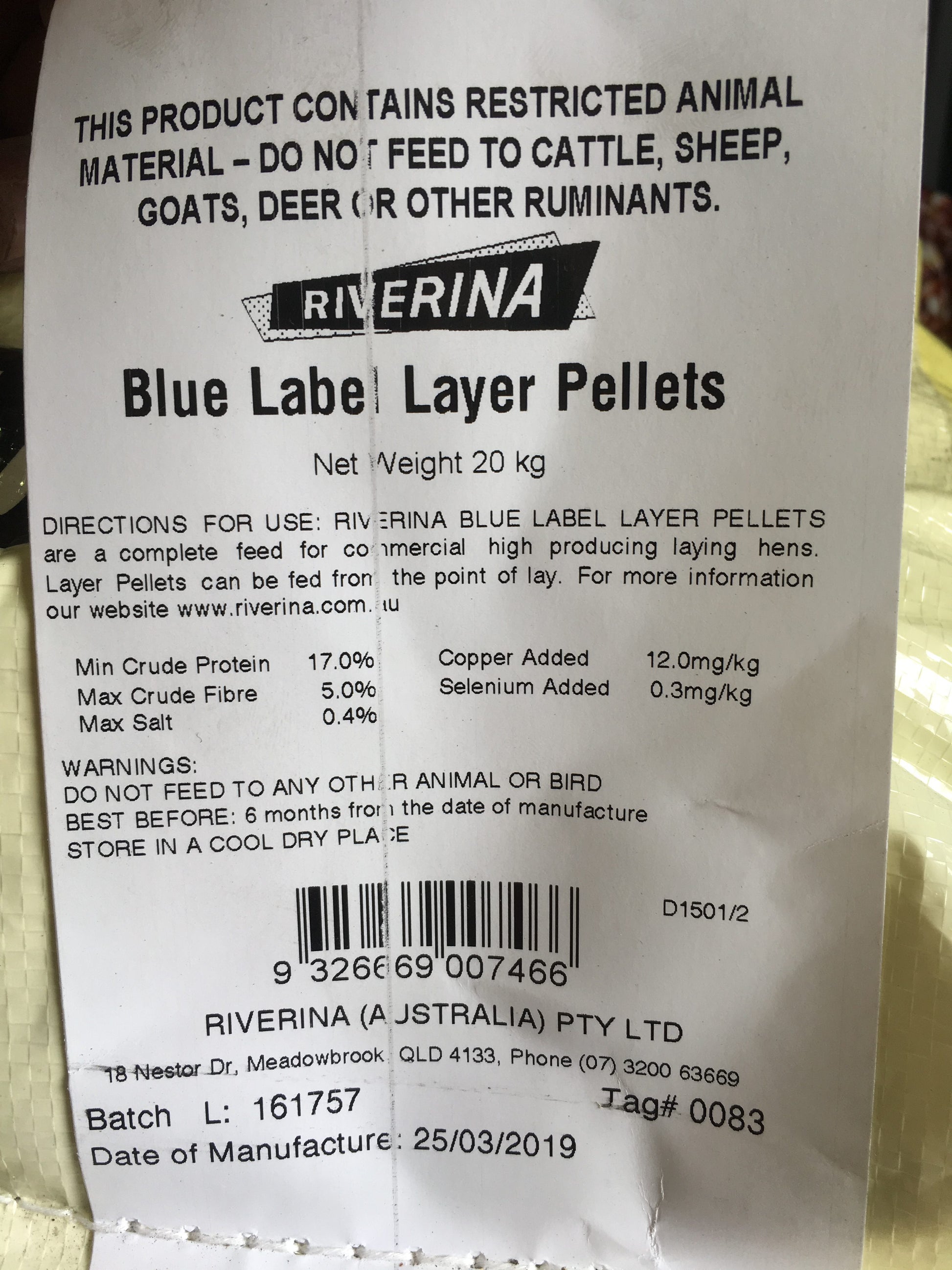 Riverina Blue Label Premium Layer Pellets 20kg