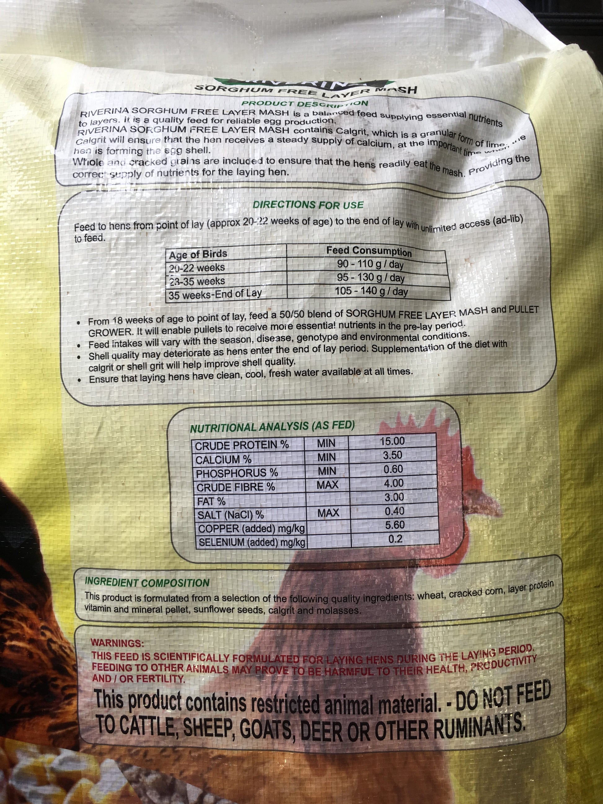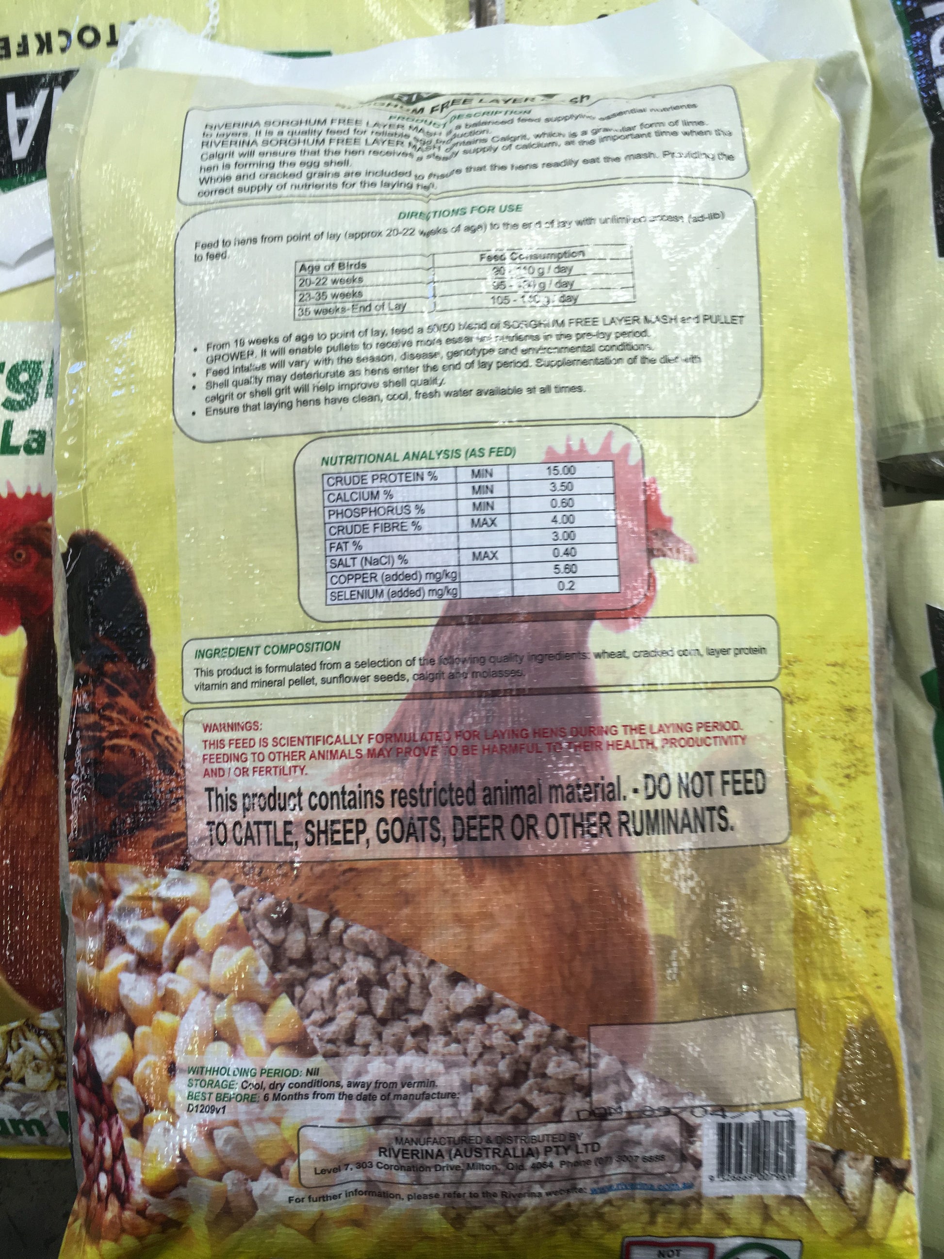 Wheat, cracked corn, bran & pollard, combination of protein meals, vegetable oil, dicalcium phosphate, calgrit, molasses, salt, bentonite, mould inhibitor, Riverina vitamin & mineral premix.