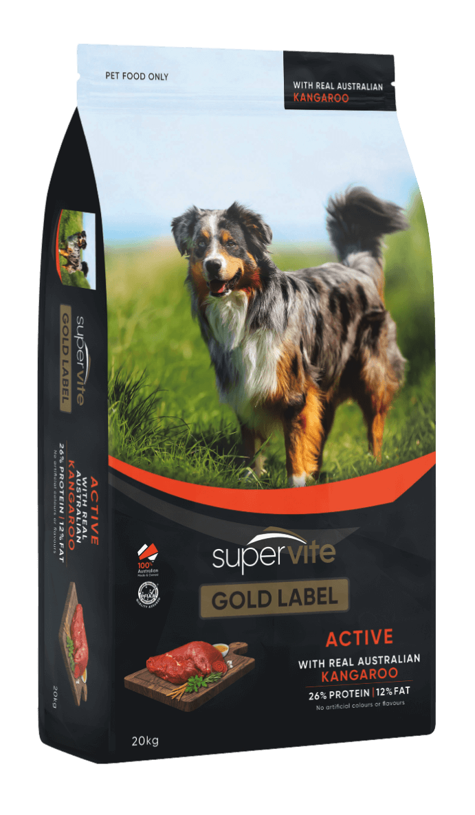 Supervite Gold Label Active Dog Food with kangaroo is a nutritious choice for active dogs. Made with high-quality kangaroo meat, it supports strong muscles and provides essential energy. This formula helps keep your dog healthy and active every day.