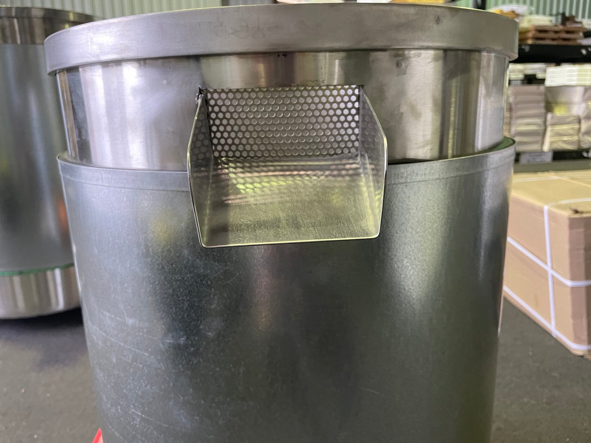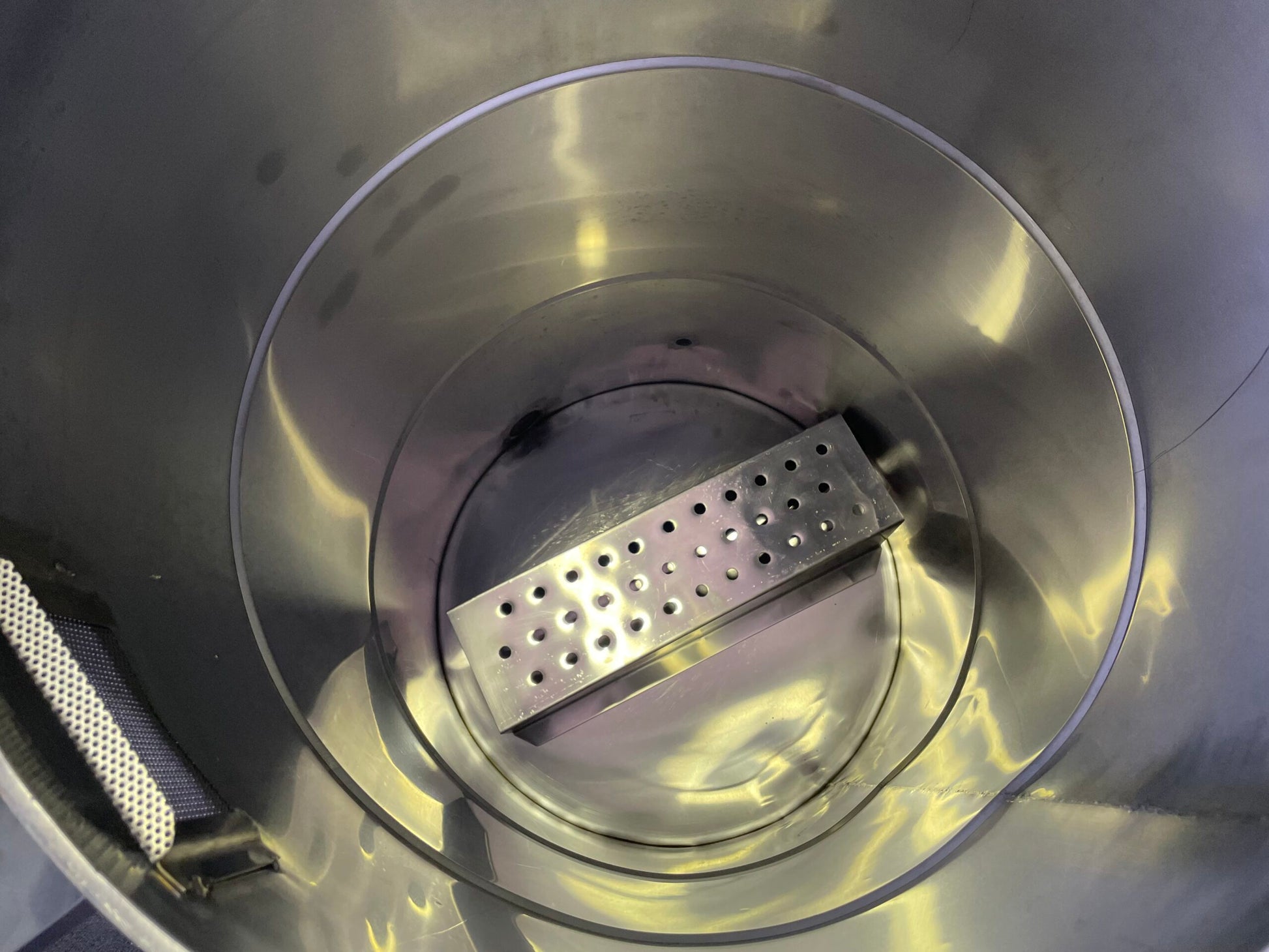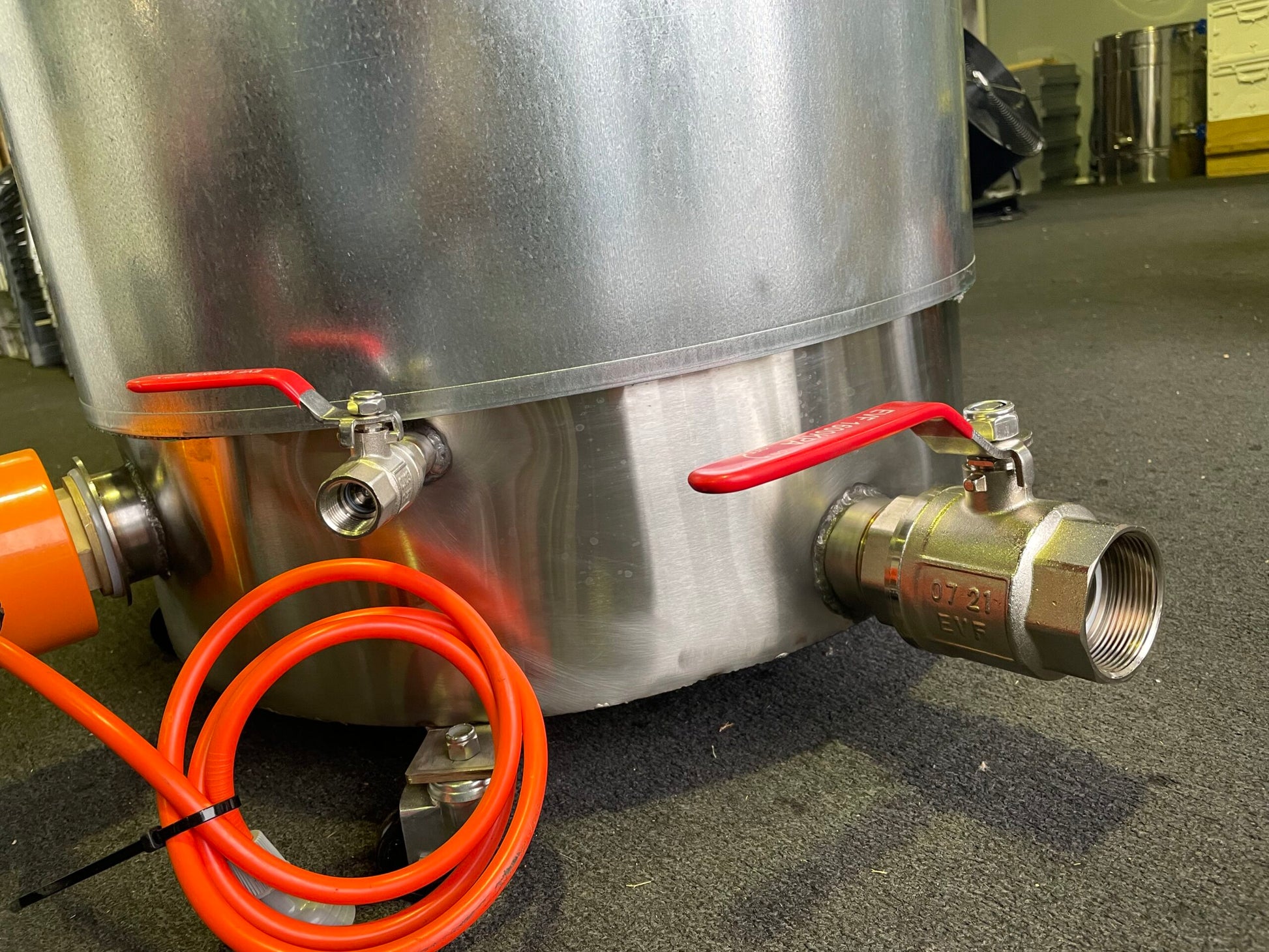 This tank acts as a double boiler and uses water for controlling the temperature around the tank. Made from stainless steel. Comes with a ball valves.